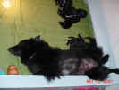 Click here to see the Puppies' Growth Chart. This chart will be updated as often as possible to reflect the puppies' weights. Click on any thumbnail photo to see a larger version. May 19 (14 days old -- end of week #2): I managed to sneak a couple photos while the pups all had their heads buried in mom's fur nursing away. If you look carefully at the larger version of the image on the right you'll be able to find 9 little tails. (Be sure to count the one between Keeper's rear legs and the one between Keeper's front legs!) You can see how much they've grown by comparing how much space they take up in the photo! Lt. Blue, Gold & Pastel are all over 2 pounds, with the rest following close behind. All eyes are open today and a few more can make out shapes. Everyone is getting involved in very short play sessions (2 minutes), usually after eating and before napping for an hour or so. Then the eat, play, sleep cycle starts all over again! May 18 (13 days old): The past 24 hours have been very interesting for the Lt. Blue puppy. Last night he got reprimanded by Keeper for getting next to her food dish. He didn't know what he was doing...poor guy. In fact, I'll take responsibility for what happened. I was trying to do Keeper a favor by feeding her in the whelping box while she was nursing. I did that many times during the first week, but hadn't done so for several days. Lt. Blue was in the wrong place at the wrong time and got yelled at by his mom. He screamed as though he was dying (of course, he wasn't). After a little cuddling from me, he was fine. Then today Lt. Blue actually started to play with me. He and several other puppies have been noticing the toys in the whelping box -- nosing them, climbing on them, trying to suck on them, etc. Today he was truly playing with them by himself, and when I teased him with one, he would interact. At one point I even got him to "talk" to me by howling -- he howled back! It seems that Lt. Blue and Pastel both have working ears at this point, and everyone's eyes are open, but some are more useful than others. Lt. Blue, Pastel, White & Pink can definitely see shapes moving around them. The puppies had another new experience today. When I changed their blanket this morning, I left them loose on the carpeting in the whelping room. Interestingly, Purple was the least interested in exploring (in the whelping box, Purple has been the go-getter). Dk. Blue and Red were the explorers, venturing a couple of feet away from me. Everyone is getting a little more coordinated on their feet, and several are actually eliminating on their own. Can you imagine what a "non-dog" person must think reading this? It's amazing what makes a breeder's day! May 17 (12 days old): No new photos for the next few days as the puppies' eyes are all opening and at this time they are very fragile. Exposure to very bright lights (such as camera flashes) can be damaging. I tried taking some non-flash digital photos a couple of days ago without much luck...will try again perhaps with the old-fashioned film camera! It will be a few more days before their eyes can distinguish very much, and it takes even longer for depth perception abilities to kick in. All the puppies are walking now, taking 2 to 6 steps before losing their balance and toppling over. Their tenacity is amazing...if I fell over as much as they do I'd just give up and go back to crawling! They are also getting faster and stronger. When Keeper enters the whelping box, there's a race to get to her...and several always make it before Keeper is able to lie down. So, she squats for a moment, trying not to squish anyone, lets them think that's going to be her spot, and then she quickly moves to another corner of the box where the coast is clear. She definitely has a system worked out! I am constantly amazed at Keeper's nursing routine. She starts out lying on her side, but after a while she always rolls on to her back, which causes a very humorous scene as the puppies do their best to hang on...reminds me of a puppy version of the show "Survivors!" Those who fall off, just get back up and try again. Now they're getting tall enough that they can stand on their hind legs and reach the nipples without having to climb on top of Keeper. The final portion of the nursing routine is when Keeper flips totally over to the other side and pushes off from the side of the whelping box. Maybe this is her way of making sure her tanks get emptied equally on each side! We've continued our schedule of having a new visitor each day. Keeper is so happy to see people that she nearly knocks them over when she greets them. A couple of times she's been so eager to leave her whelping room that she's knocked the baby gate over, and she spends a fair amount of time with her front legs on top of the gate peering down the hallway to see what everyone else is up to! Many of the puppies are trying to nurse on the visitors who hold them, and everyone is surprised at the amount of suction those little mouths can generate! I continue to be impressed with Keeper's mothering skills and her stamina...she tends to her brood and still has energy to spare, asking to play frisbee several times a day now! May 14 (9 days old): It is just amazing to see the changes in these little guys over the past couple of days. The changes are subtle, but important. Every puppy is gaining weight and their little legs are getting stronger. They are able to "stand" momentarily and then they lose their balance and topple over. It'll just be a day or two before they're doing the puppy version of walking. Their eyes are not closed as tightly any more...in a couple of days they will begin cracking open, as well. When their eyes are opening, and for several days after, it's important that they not be exposed to bright lights, such as camera flashes. The puppies are slowly gaining the ability to regulate their own body temperature, so the whelping box thermometer now reads 80 to 85 degrees, instead of