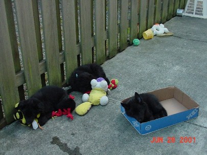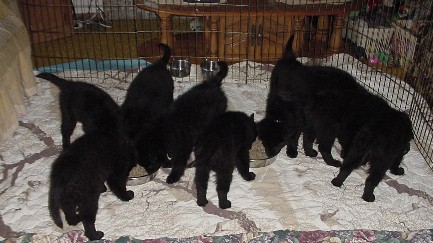 Click here to see the Puppies' Growth Chart. This chart will be updated as often as possible to reflect the puppies' weights. Click on any thumbnail photo to see a larger version. June 30 (56 days old): Click here to see updated puppy pages! See new head shots and profiles of beautiful puppies learning to stack on the grooming table! Alyssa & Miss Purple (left); Alyssa & Keeper & puppies (center); Alyssa, Keeper & Baccarre' & puppies (right). Keeper & Baccarre (left); Tired puppies (center); Tire & full puppies (right). Hungry pups wondering why it takes so long to make their dinner (left); Miss Pink & Miss Gold wait patiently for their dinner (center); Hungry pups dive into their food (right). Click here to see a comparison photo of pups the first time they visited the living room...see how much they've grown compared to the photo at right, above. The past two weeks have been crazy! As the puppies' world expands, the amount of time, effort and energy that it takes to keep up with them has grown by a zillion percent! Individual personalities are definitely emerging, as are cute characteristics that make each puppy special. I've been spending a great deal of time observing the puppies in familiar surroundings, as well as placing them in new situations, to help me in the "match making" process. My goal is to make sure each family ends up with the best puppy for them and their lifestyle...and I'm 99% certain of who's going where!