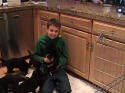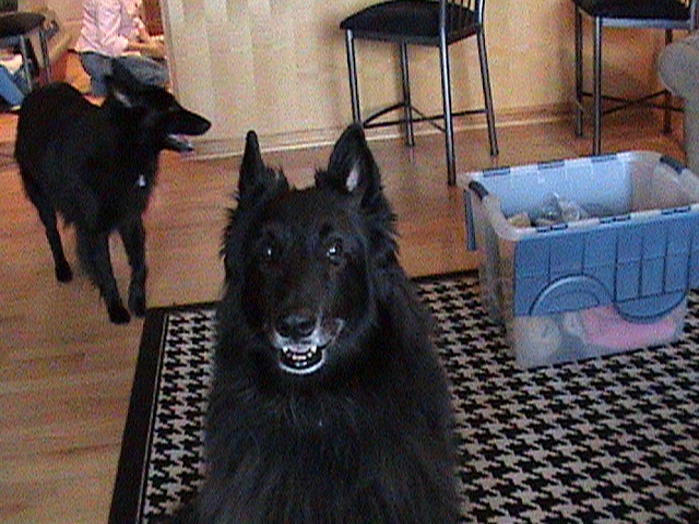 Monday, October 9, 2006 -- Day 21 Today the puppies went on their first road trip to the training center (above). Laurie Cottier plays with puppies prior to teaching her home obedience classes. Other visitors that afternoon included Cathy, Katrina and Sondra. We spent almost two hours in the office, and as you can see from the photos, the puppies were worn out after exploring the office. I did not take them into the training area yet because it's a little too cold out there for them right now and I want their first visit to the training area to be with just Flame (no other dogs present). They still haven't met any of my other dogs yet, either. In the next few days I'll let them sniff noses through an x-pen. It's important that Flame not feel threatened with the other dogs coming closer to her puppies and it's important for the puppies that their first introductions to other dogs be quiet, relaxed and positive. It'll be at least another week or two before I allow them to interact with Keeper, Journey or Tyler...I'll just have to see how things go. In preparation for their first road trip, I got the puppies used to being in a crate by first setting up just the bottom half of a small Veri-Kennel in their play area at home. I would pick the puppies up and set them in the crate, let them stay there as long as they wanted and then crawl out when they felt like it. After a day or two of this game, I put the top on the Veri-Kennel but left the door off. We did the same thing. Within a couple of days the puppies were crawling in and out on their own, so it was no big deal for them to go in and have the door closed. I transported the puppies to the training center in a 200 size crate, so they could all be together. I planned their entire day around their first trip by making sure they had a good meal and lots of play prior to leaving the house about 2 pm. That made it easy for them to sleep in the crate, which they did. Although they didn't play all that much once we got to the training center, that was okay because the priority for the day was having a successful first car ride. Traffic was light, so the ride only took about 20 minutes each direction. We were back home by 5:00 pm. As a breeder, I always try to look at things from the puppies' perspective and make sure that all new experiences are choreographed to be as positive as possible. I want their first impressions & first experiences to be only happy memories. Other things that I did to make the event a positive one for both Flame and the kids: When we got to the training center I took Flame in first so there was plenty of her familiar scent in the office. I set up an x-pen and brought a blanket from home to put on the floor (again, familiar scent for the puppies). I then brought the puppy crate in and let them just sit in it for a few minutes while Flame made sure her kids were inside. After that the crate was put inside the x-pen with Flame, the door was opened and their immediate reward for coming to this new place was seeing mom and getting to nurse. Once the puppies had a snack and were awake, we opened the x-pen and sat on the floor while Flame watched from behind a gate in the hallway. Puppies were allowed to roam (safely) in the office, climb on everyone's legs, play with toys that Katrina brought for them, etc. After 30 minutes or so of exploring, playing and handling by everyone, the puppies were ready to nap, so they were collected back in their x-pen while I did a little office work. While they were still sacked out I gently placed everyone back in their crate to come home. When we got home, I set up a similar situation by bringing Flame in first and letting her into the puppy area before I brought the crate in. When I opened the crate door, puppies were coming back into a familiar environment. They had a brief snack and then crashed for several hours. An exciting day for all of us! Tuesday, October 10, 2006 -- Day 22 I started offering the puppies "solid food" this past Sunday. Stephanie came over and we stuck our fingers into a shallow Rubbermaid lid of warm, mushy kibble that had been soaked overnight in water, pureed in the blender and warmed in the microwave. This delightful introduction to their eventual diet of Back to Basics kibble resembles thick cream soup. We enticed each puppy to lick some mush off our fingers, but none of them were all that interested in lapping from the lid, which is pretty normal. Puppies are getting their baby teeth. Everyone has multiple teeth that have broken the surface, so nursing is going to become more painful for Flame in the next few weeks -- all part of nature's way to help with weaning. The baby teeth will also help teach the puppies bite inhibition as they continue to rough house with each other and their mother. A painful bite to mom's ear or a littermate's leg will result in an angry outburst! Twice a day since I have repeated this mush introduction prior to letting the puppies nurse. This morning was the first day where all the puppies successfully "ate" more of their mush than they got all over their bodies and blankets. Only the Purple Girl still seems less than excited about this new diet; everyone else is eating eagerly. I am still letting the puppies nurse after their mush to make sure everyone gets enough to eat. I've also attached a small water dish to the side of the x-pen and am taking the puppies over to it a couple times of day. Purple Girl was actually lapping water on her own. The gate to the kitchen, which has a vinyl floor, was opened for the puppies today for the first time. I used Flame to get them to follow her into the kitchen, which everyone took in stride except Orange Girl. She just couldn't get her footing, so ended up crawling more than walking. Puppies then followed Flame back to their puppy area and after a few minutes I put a blanket on the kitchen floor, an x-pen around it and put all the kids in there while I replaced all the blankets in the puppy area.
