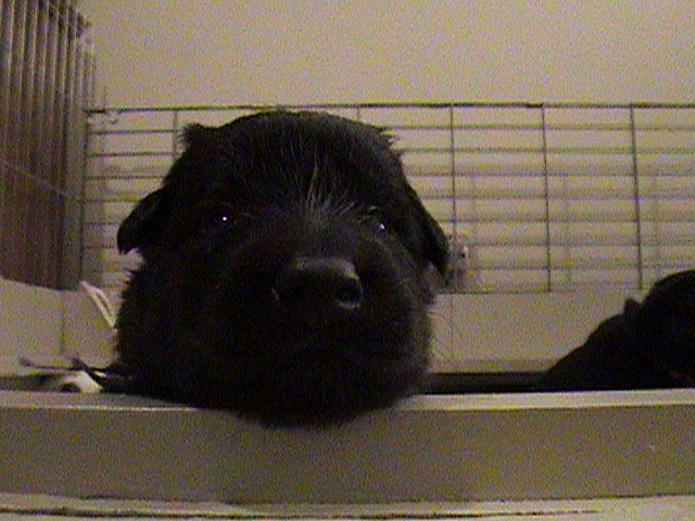 Wednesday, October 4, 2006 -- Day 16 I wasn't able to keep track of who's who in the above "head shots" but aren't they cute? (Photos were taken without extra lighting because puppy eyes are still sensitive to bright lights.) Teal Blue Boy was certainly hamming it up for the camera. It's amazing how quickly puppies develop. They are all now walking more than crawling, and don't fall over quite as often. Everyone is tall enough to almost reach the milk machine when mom walks into the whelping box and it's just a matter of days before the "prisoners" will be escaping from their box. (The x-pen security fence has been erected, so even if they escape from the box they'll still be secure.) In the past several days we've had several visitors, some of which Flame is more comfortable than others. She got extremely uppity with Judy Else, so I instituted a different program for visitors. Up until now I've had Flame greet visitors in the living room and then allow her to be present when the visitors moved into the dining room (aka whelping room). Now I am making Flame wait behind the gait in the kitchen where she can see what's going on, but I'm not letting her back into the whelping room until after the visitors have gotten settled and interacted with puppies. It was time to tell Flame that they may be her biological puppies, but it's MY house, MY dining room, MY whelping room, etc...and she has to accept the people that I invited into the house. So far this new "tough love" approach seems to be working. Yesterday Cathy & Sondra came over to help worm the puppies (and Flame) for the first time. Everyone sucked the Nemex II out of the syringe without any problem. Later in the day Cheri & Kendra came over so Cheri could cut my hair (THANK YOU CHERI FOR THE HOUSE CALL!) and daughter Kendra could play with puppies. Flame doesn't know either of them at all, and my new configuration worked well. I've added a few more toys to the whelping box and everyone is starting to suck, push, pull on the various objects. The funniest thing is when I turn on the happy birthday cake toy (which plays the happy birthday song) and all the puppies howl in unison. I've started doing my "puppy puppy puppy" call when Flame & I come to the whelping box and everyone comes running. Tomorrow I'll add a metal & leather scent article to the whelping box -- you can't start articles too young, you know!