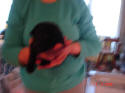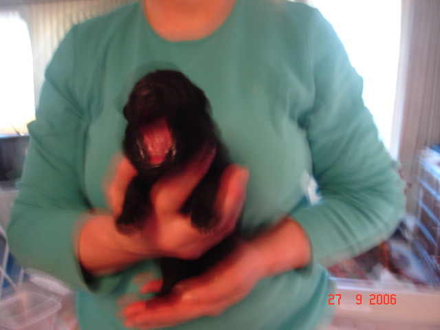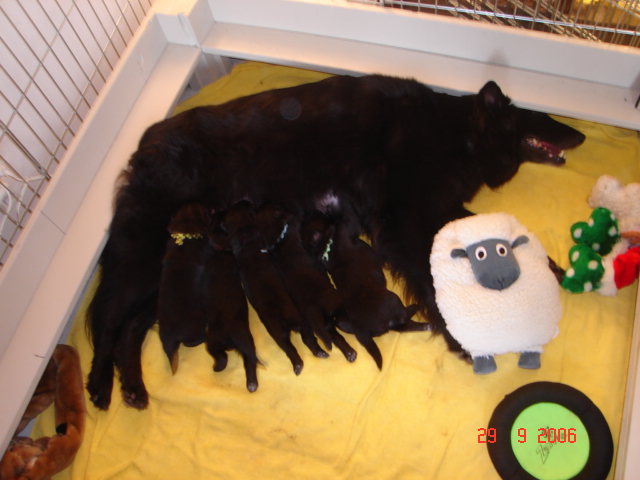Monday, September 25, 2006 -- Day 7 We survived our first week! And today's visitor was Stephanie Weil, Crystal's mom (Flame's sister), pictured above holding Teal Boy. Stephanie and her husband, Bob, and son, Daniel, hope to get a little boy from this litter, provided one of the boys turns out to be sweet and laid-back like their great grandpa Tyler, who's currently staying with Stephanie & family. Stephanie had never seen puppies this young before (Crystal was 18 months when she went to live with them). Continuing with our visitation program from last week, everything went very well. Flame was once again so excited to see one of her friends and she was very comfortable with Stephanie around the puppies. We did, however, put Flame on the other side of the baby gate for a few minutes so Stephanie could handle the puppies. That was fine with Flame, and when she came back into the room after the puppies were back in their box, Flame was as eager to eat more chicken from Stephanie as she was to check on the status of her litter. I am continuing to do the Early Neurological Exercises started last week, and everything is going well. Today's highlight was when Teal Boy actually stood up and pooped on his own while Flame was on the other side of the baby gate. Yellow Boy also stood on his own for a split second today. I have dimmed the lights in preparation for their eyes to start to open. I continue to leave Flame and puppies alone from about 3 to 7 pm, as this seems to be their heaviest nap time -- and Flame's grumpiest time if she's bothered. She gets a good nap in while the puppies alternately eat and nap. Wednesday, September 27, 2006 -- Day 9 From left to right, in birth order: Green Boy, Teal Boy, Orange Girl (yep, she already has a big mouth!), Yellow Boy & Purple Girl. The photos are not the best quality because we've gone to natural light in preparation for puppy eyes opening; however, look at how they've grown! Everyone has topped the two pound mark and all are within a couple ounces of each other. We did have a bit of a stressful past 36 hours. Monday afternoon Flame exhibited some aggressive behavior toward her puppies. She did not harm anyone, and her behavior was appropriate for an older puppy or dog -- just not for a puppy that cannot see or hear. I have never experienced this type of behavior in a dam, so was rather surprised. In each case Flame was cleaning one puppy when another puppy crawled toward Flame's face. Flame gave a hard stare, then a very low growl, then a snarl and finally, in two cases, snapped at the air. Flame has always been a great dog communicator. She's a dominant, uppity bitch, but has always gotten along with other dogs and puppies. She has excellent dog body language, knows how to be submissive to bitches that are more dominant than she and has a fantastic temperament. Her mother was an outstanding mother, as was her grandmother, so where this is coming from is beyond me. One possibility is that Flame was just thoroughly exhausted and stressed out. Another is that she's a bad mother. Finally, and this is my gut feeling, it's related to low calcium levels and a condition that's not widely recognized by the veterinary community called pre-tetanic eclampsia. (Click here to read more.) After this happened and I consulted several friends, I started doing some research and certainly find many similarities between the condition described in the articles and other discussion groups and Flame's situation. Monday night I started giving Flame additional cottage cheese and yogurt to boost her calcium levels, in the event my hunch was correct. Tuesday morning I spoke with me vet who agreed that bloodwork might be helpful. This morning we received the results. Although her calcium levels were normal my vet agreed that the anecdotal evidence presented in my internet research warranted conservative treatment. Katrina picked up some Cal-Sorb for Flame (oral calcium supplement) with 3 cc to be given once a day for four days. I carefully supervised Flame's nursing and cleaning sessions with the puppies after this happened on Monday, and am continuing to do so. I am not leaving her in the whelping box unsupervised. When she is with the puppies, I am right there to monitor. If a puppy crawls too close while Flame is cleaning another, I just redirect the puppy. I also have a soft muzzle in case her behavior worsens. Yes, it's time-consuming and a hassle and stressful, but it seems to be working. It also seems to be helping Flame (and me) get more sleep. We are sleeping together on the kitchen floor so we are close to the puppies. Up until now, Flame has only slept a few minutes at a time. It has been interesting to research this whole situation. I don't know if the additional calcium will help Flame's behavior but in the meantime, the puppies are doing great and the situation is manageable. If the worst case scenario comes true, that Flame turns out to be a bad mother, Grandma Keeper is waiting in the wings, eager to nurture and mother the puppies. She can't provide milk (she's been spayed for several years) but she can do everything else. Back to the puppies...they are changing so quickly. Eyes are starting to open; everyone has little slits. Ears are twitching more. Noses are becoming more sensitive, not only to Flame's comings and goings, but also to my arms and hands in the whelping box. As Cathy Horrocks so aptly describes their movement at this point, they're like little alligators. They are getting up on all fours, standing and stumbling forward, standing and tipping over. As Flame enters the whelping box, they're up and ambling toward the milk machine. When my arm or hand reaches in, they head in my direction, resting their heads on my arm, sucking on my fingers and nuzzling my shirt. Behaviorally it's interesting to note how vigorously these puppies nurse and how close they are in weight. I am continuing the early neurological stimulation exercises and today was anot